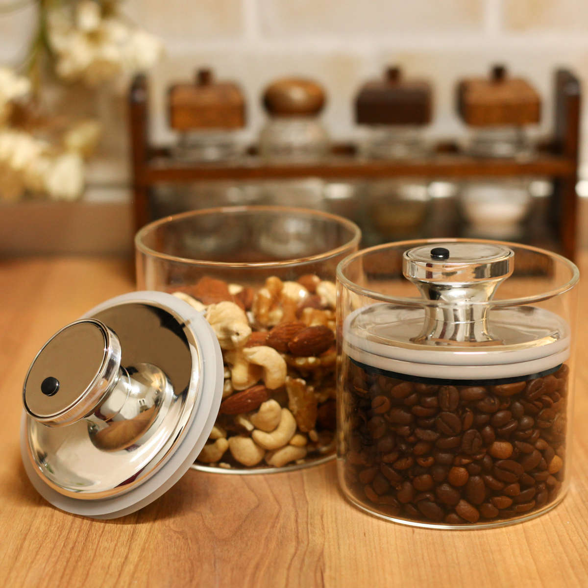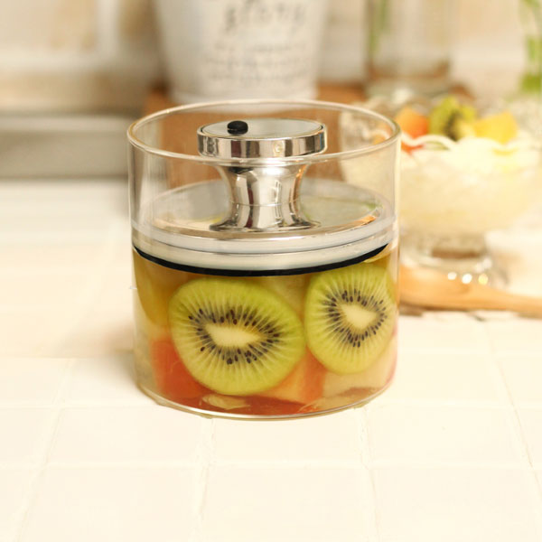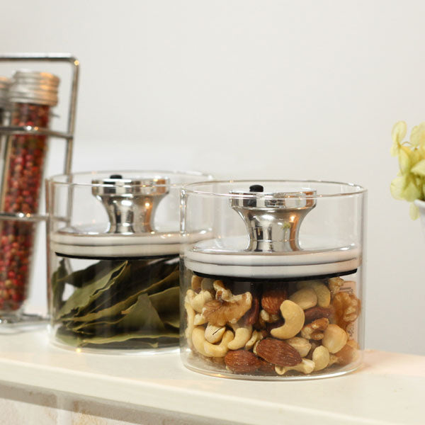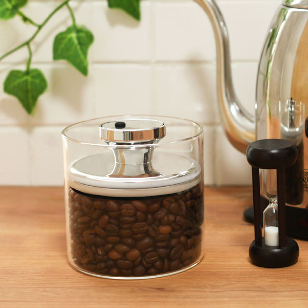 余分な空気を減らして酸化を防止し、湿気を嫌う茶葉やパスタ、コーヒー豆が傷みにくいガラス容器です。