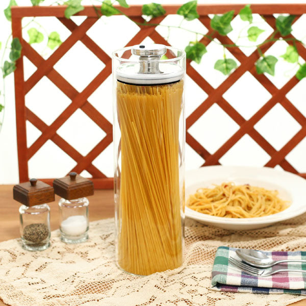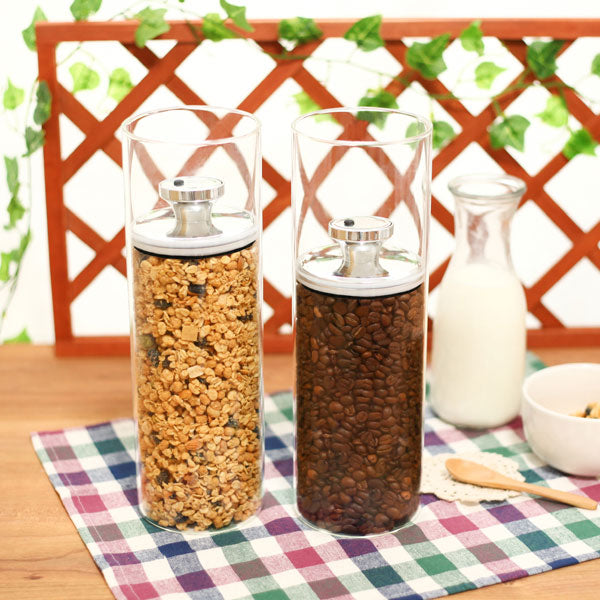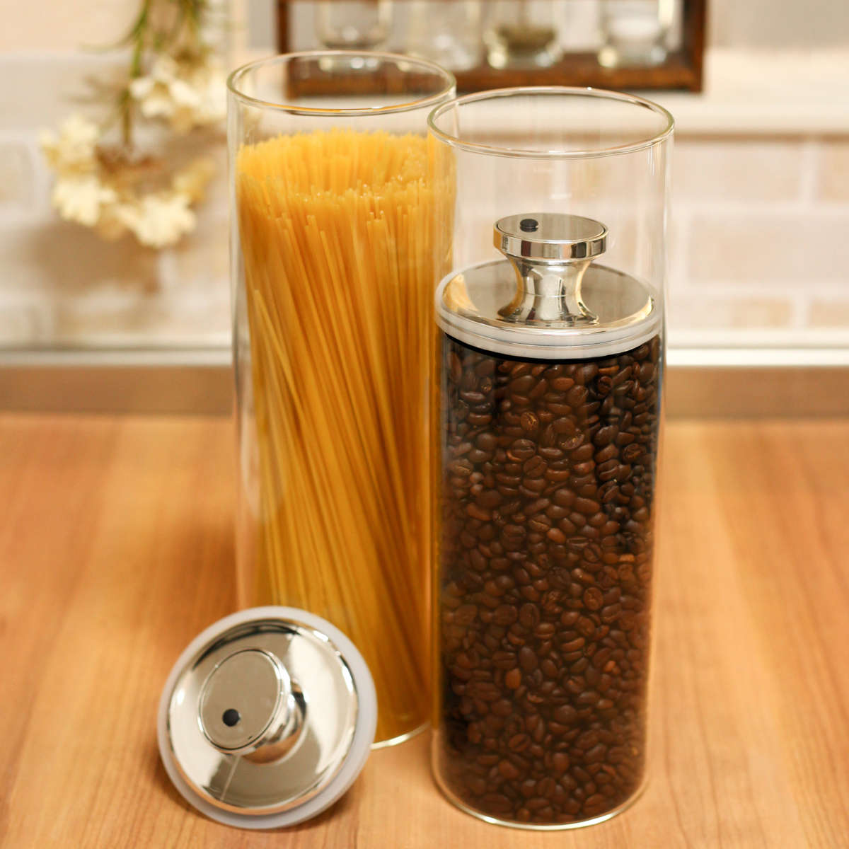 余分な空気を減らして酸化を防止し、湿気を嫌う茶葉やパスタ、コーヒー豆が傷みにくいガラス容器です。