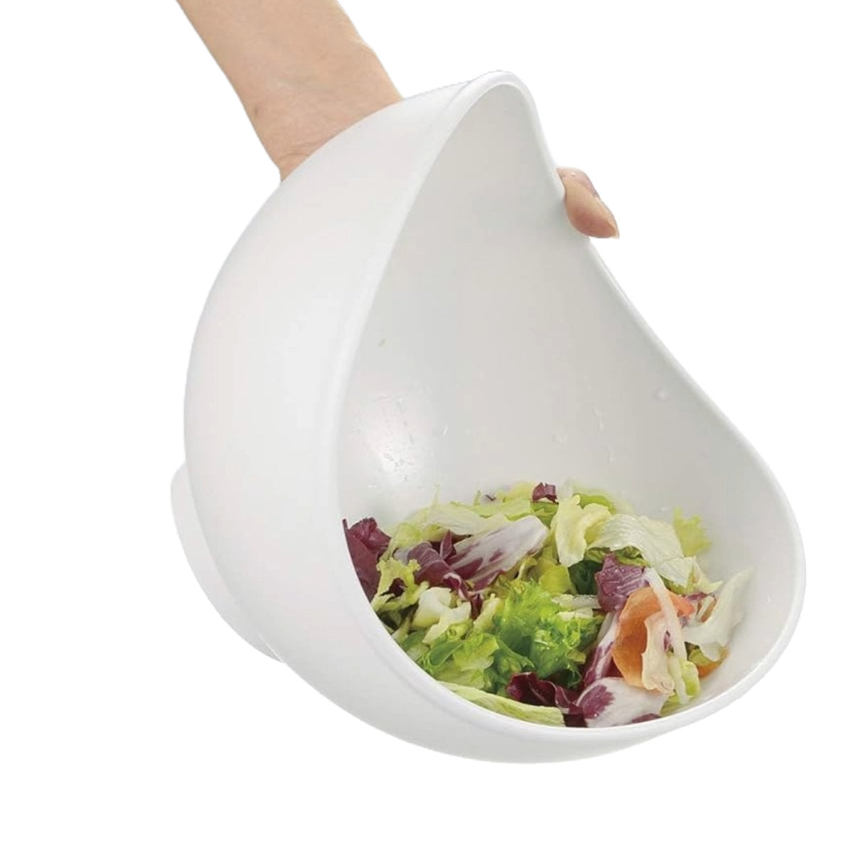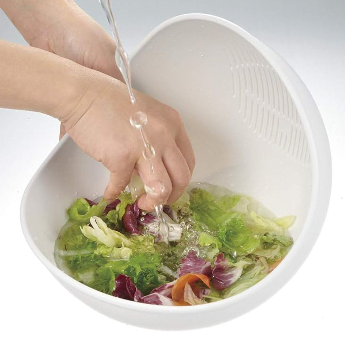 食材を洗った後そのまま傾けるだけで水切りもできる、ボウルとザルの機能を併せ持った便利な水切りボウルです。「洗う・和える・さらす・水切り」の4つの使い方ができます。