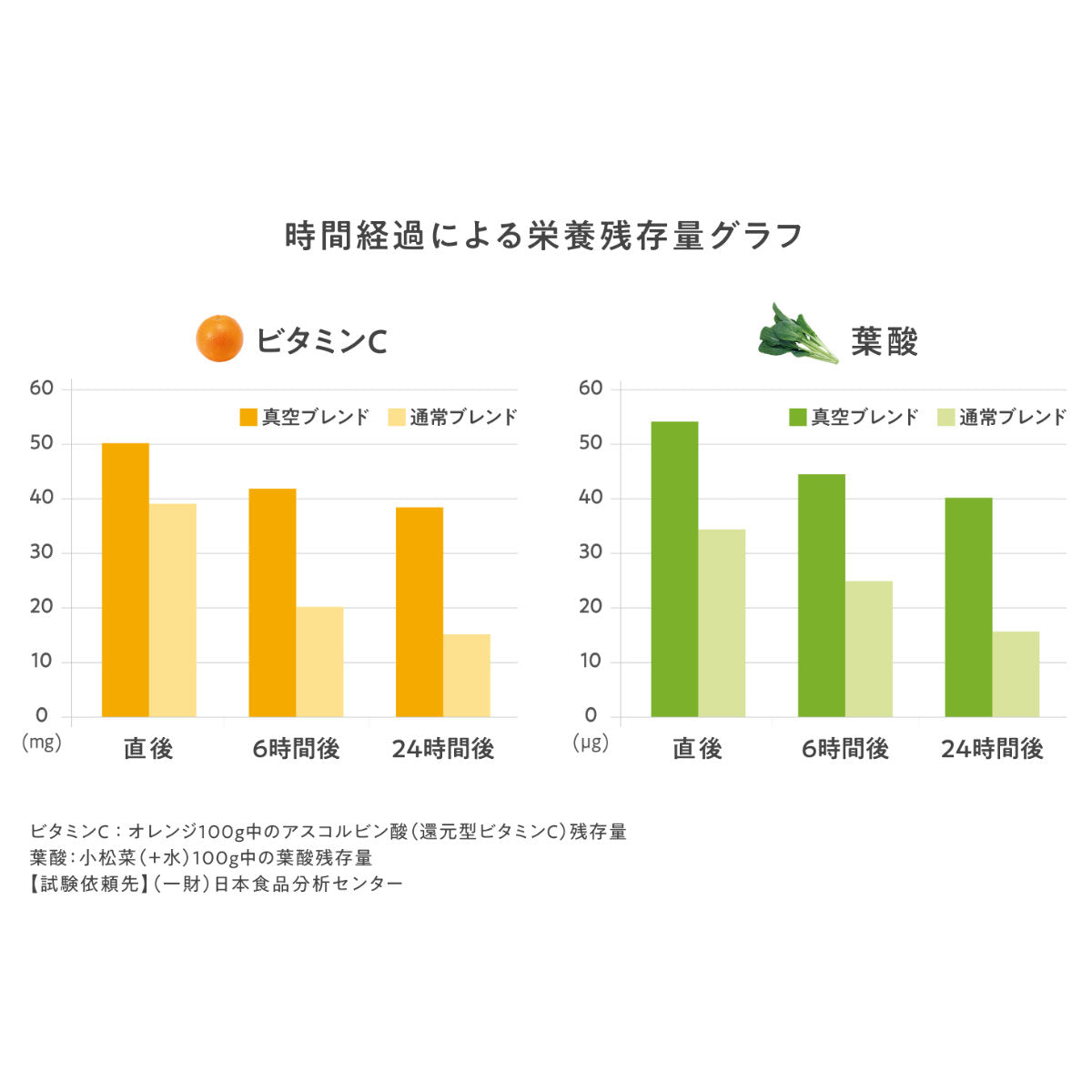 「ビタミンC」、「葉酸」、「ポリフェノール」などの栄養素を空気による酸化から防ぎます。通常のブレンダーと比較すると、真空ブレンダーは時間経過による栄養の損失が少ない事が分かります。
